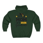 Soft, cozy zip hoodie designed for moms celebrating a graduation milestone. The front chest carries a small embroidered emblem while the back proudly displays a bold “Proud Mom of a 2026 Graduate” graphic with a graduation cap and accent stars. The medium-heavy cotton-poly blend feels substantial yet comfortable for cheering at ceremonies, post-ceremony photos, or quiet mornings with a cup of coffee. Classic fit and roomy pockets add everyday practicality. Subtle wrist prints and durable metal zipper details give this hoodie a finished, thoughtful touch that honors the occasion without shouting.