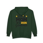 - Embroidered left-chest emblem plus large back DTG graphic celebrating 2026 graduates